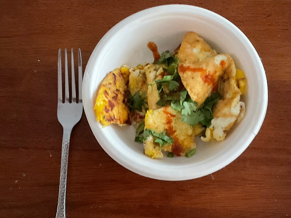This is Spancy Egg. A “Spancy Egg” is a well seasoned fancy scrambled egg with a drizzle of hot sauce.